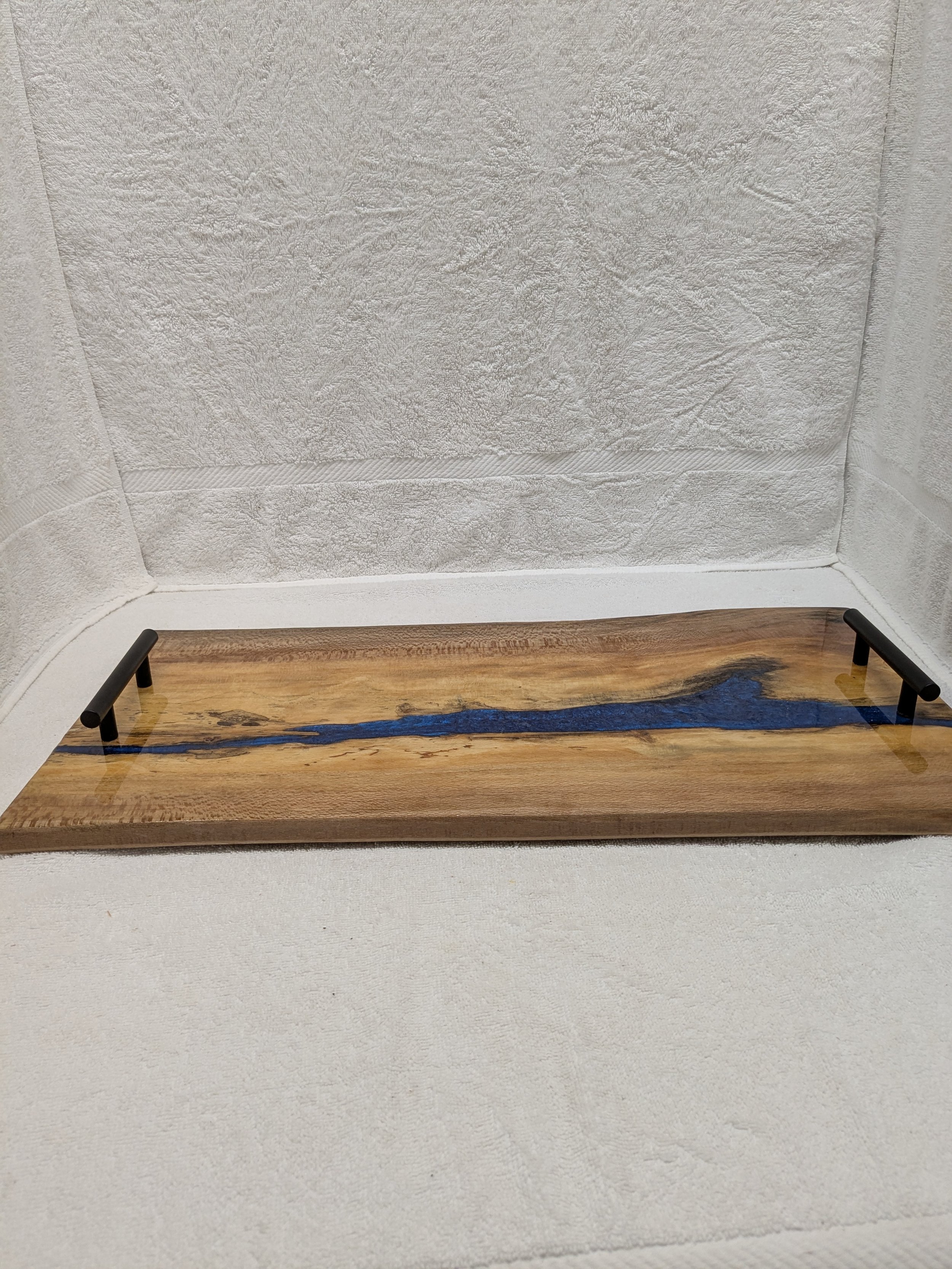 Experience the beauty and functionality of the Sycamore Charcuterie Board, measuring 23 inches in length and 12 inches in width. This stunning piece features a blue epoxy resin that elegantly fills the natural flaw of the wood, adding a touch of artistry to its design. The top is sealed with a food-safe resin, ensuring safe use for your culinary creations.